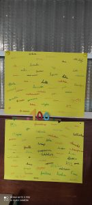 Le défi du jour, c’était d’écrire 100 mots qui nous faisaient penser à l’école. Tous ensemble nous avons réussi !